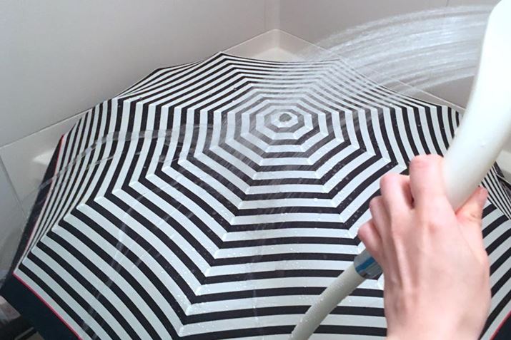 では、普段使いしていたほうの傘にも、1分間のシャワーを浴びてもらいます。