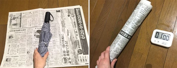 まずは、普段使いしていた傘から。軽く水気を切って折りたたんで新聞紙に包み、同じく1分放置してみます