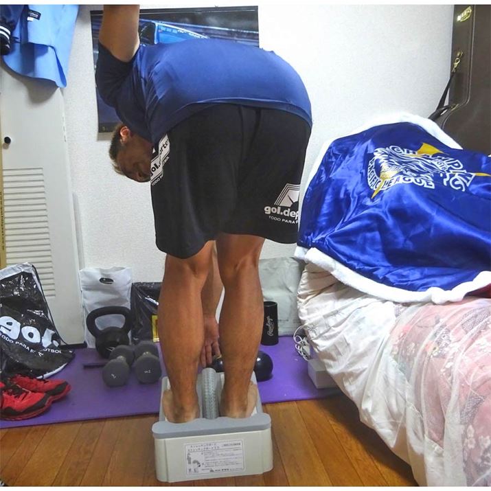 乗った状態からかがむと、ふくらはぎよりハムストリング部分の張りが強く◎。器具の先端部分に手がギリギリ届くようになりました