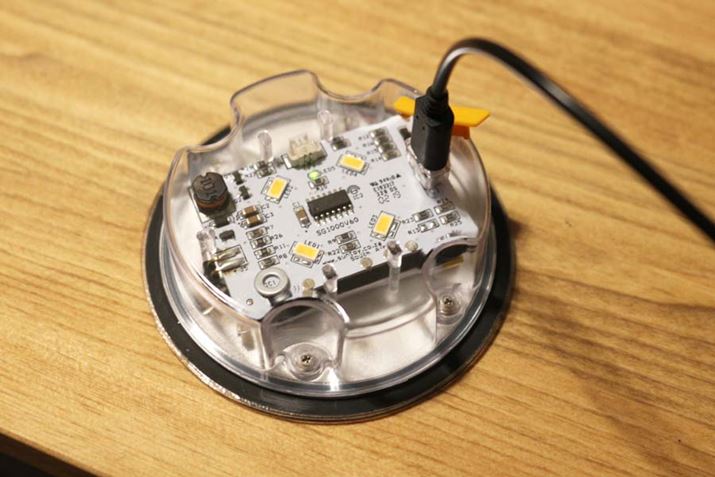 ワイヤーの先に付いたマグネットを、ソーラーチャージパネルの白い〇マークに合わせるとライトが点灯。このワイヤースイッチは、ヨーロッパのビール瓶ワイヤーをモデルにデザインされたそうです