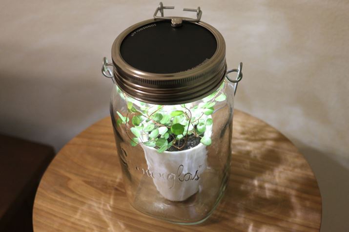 瓶に入れてフタをできるので、ペットや小さな子どもにちょっかいを出されやすい小物などを入れておくのにもよさそう。LEDランプは長時間点灯していても熱くならないので、安心して使用できます