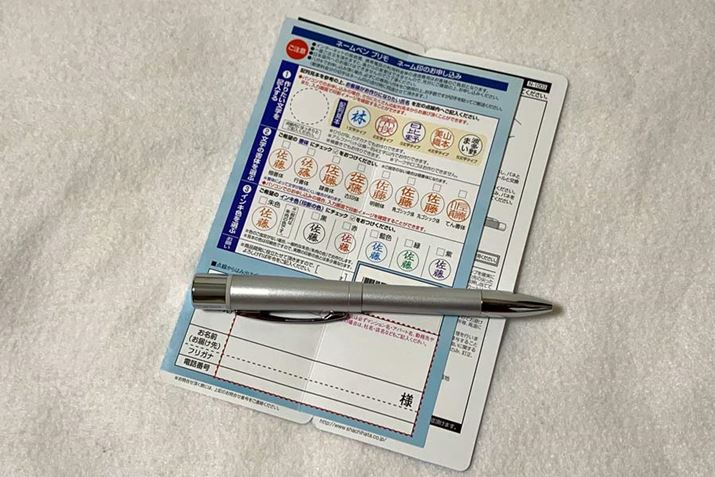 印面は本体と一緒に送られてくるハガキやインターネット経由でオーダーします。5種類のレイアウト、8種類の書体、6種類のインク色から選べます