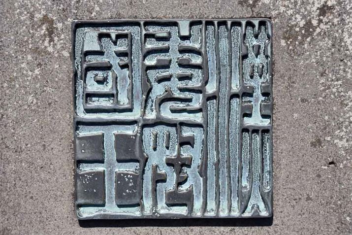 金印公園(福岡県福岡市)の「漢委奴国王印」石碑。天明4年(1784)、志賀島の農民甚兵衛が、大石の下から「漢委奴國王」金印を発見したと伝えられるが、出土地や発見者について疑義が出されており、金印出土の謎はいまだ解決されていない(出典:http://bunkazai.city.fukuoka.lg.jp/)