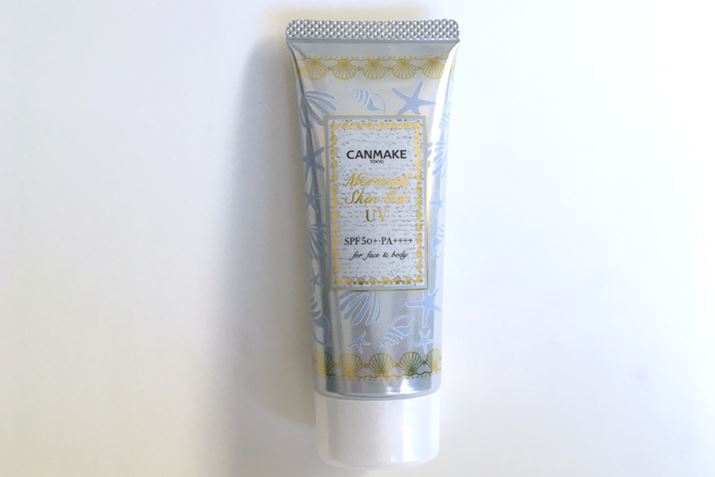 プチプラで人気のCANMAKE(キャンメイク)から発売されている「マーメイドスキンジェルUV」。透明タイプ(01)と白肌タイプ(02)がありますが、今回はトーンアップ目的なので白肌タイプをチョイス。鉱物油フリー、パラベンフリー、アルコールフリー、無香料。洗顔後にすぐに顔や肌に付けられる化粧水感覚で使える日焼け止め。美容液成分を83%配合