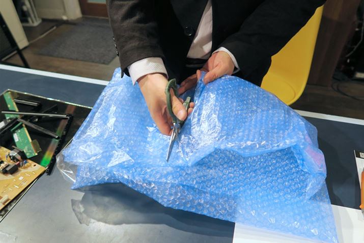 パソコンを包むプチプチのシートも簡単に切れる。これ、普通のハサミだと切りにくいんですよね。