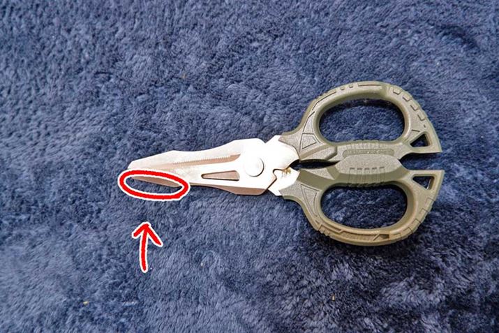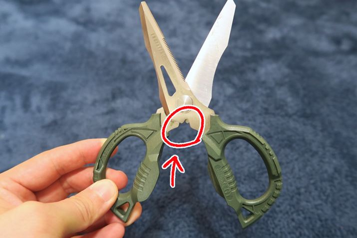 ハサミの持ち手側には「ワイヤーカッター」もついています。切断面の直径が1.2mmまでの針金に対応しています。