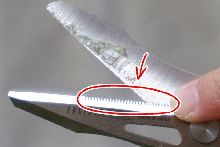 厚い布が切れる理由はハサミについている「ギザギザの刃」です。これが布にうまく噛(か)んで、着実に刃が通っていく。