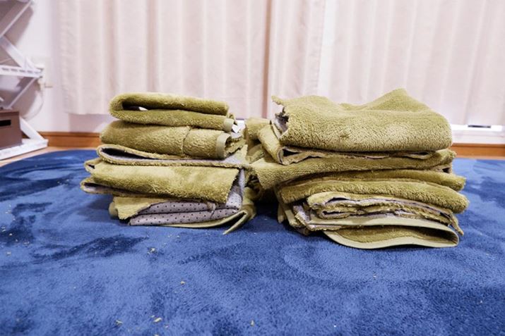 使わなくなってしまった大きめのラグ。普通にゴミに出すとしたら粗大ゴミになってしまいそうです。しかしこれも鉄腕ハサミGTなら切れそう。やってみましょう。