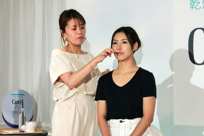 「Curel Care Night」には、「おフェロメイク」の生みの親としても知られるヘアメイクアップアーティストのイガリシノブ(左)さんと、キュレルの広告モデルをつとめているモデルの辻本舞さん(右)が登場。2人とも乾燥性敏感肌ということで、キュレルを愛用しているそう