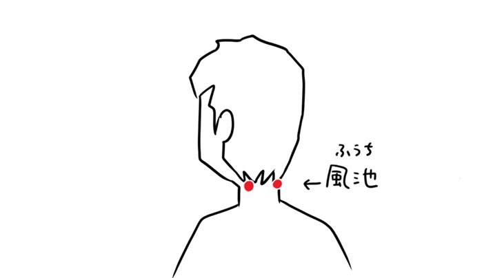 それは「風池(ふうち)」というツボ。首と頭の境目の両側にあります。ちょうど先ほど紹介した「僧帽筋」の外側の縁あたりです。