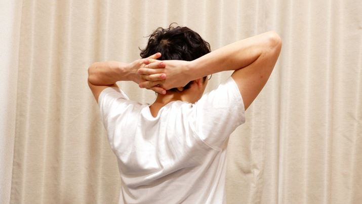 頭の後ろで手を組んで親指で押す。風池を自分で押すとしたらこんな感じです。これはこれで気持ちがいいのですが、自分で押しても、やっぱりちょっと力が入りにくい。