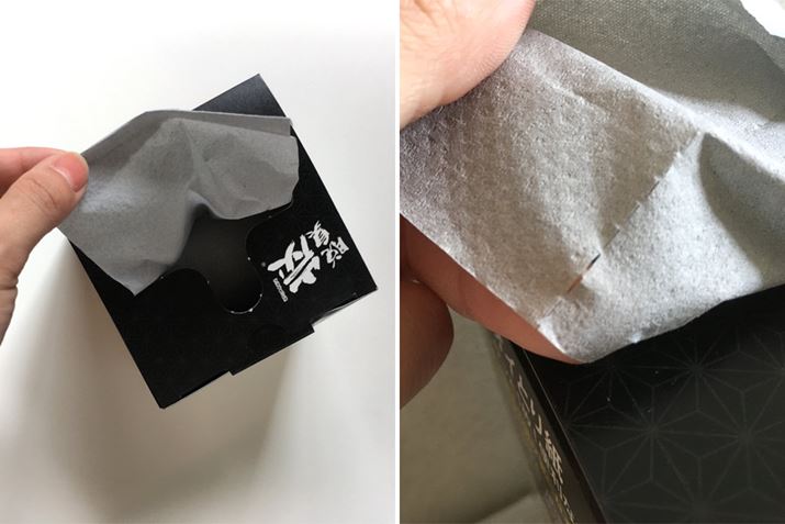 こんな風に外箱にセットして、ティッシュのように使います。15cmごとにミシン目が入っていて、トイレットペーパーのようなティッシュのような……