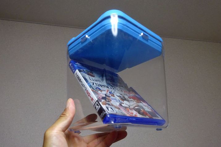 PS4のソフト1本がぴったり収まる絶妙なサイズ。透明なコンテナは封印したモノがよく見えるので、存在そのものを忘れ去ることはできず、待ち遠しさが増しました