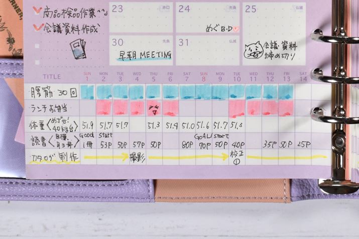 さらに、従来は独立していた「ガントチャート」のページ(見開きで2か月分)は、「月間ブロック」のページに統合された。この部分は簡略化というよりは、予定と進行管理(またはハビットトラッカーなど)が一覧できるようにするためと言える。