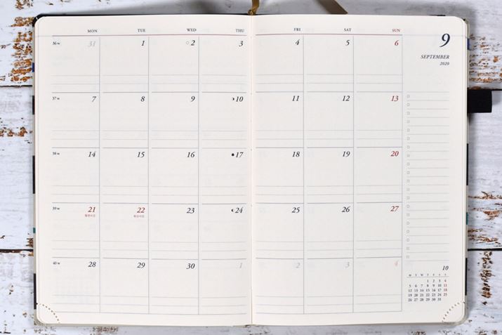 「月間ブロック」のページ。1日の欄は、上半分に大きめスペース、下半分に罫が2本引かれている。JMAM製ながら、元号や六曜などは省かれてすっきりとした印象。国民の祝日と月齢表記はあり