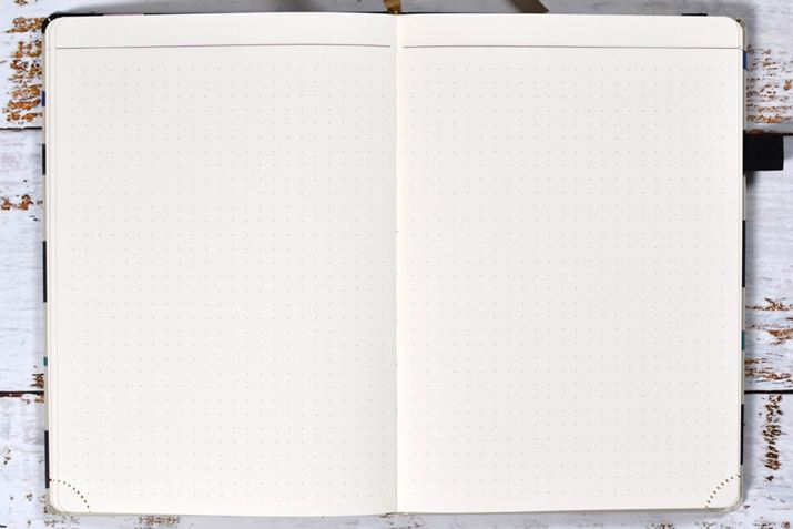 ノートページは、ドット方眼を採用。上部の赤いラインがタイトルやテーマを記入するのに便利だ。ページ下の角に備わっている「ポッチング」と呼ばれる部分は、ミシン目で切り取ることができ、最新ページをすぐ開くためのインデックス代わりに利用できる