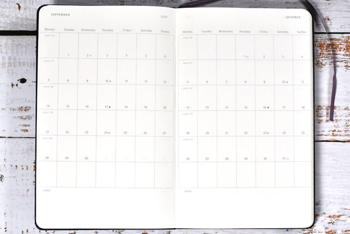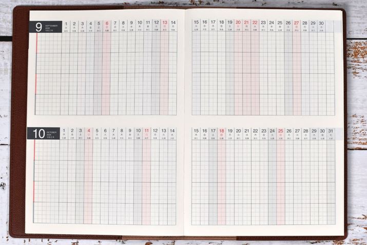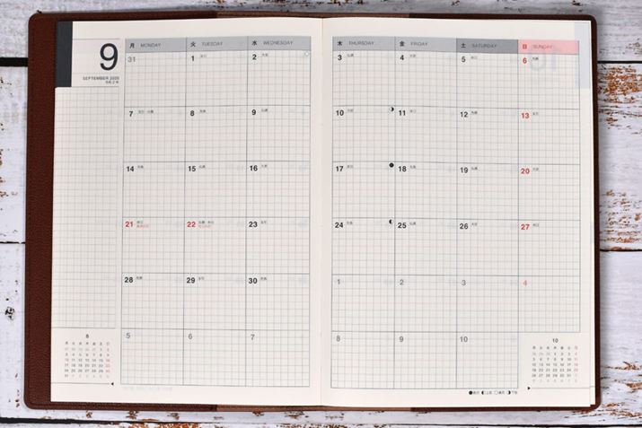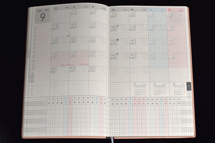 そんな同社の手帳の中でも、このホリゾンタル式のメリットは、汎用性が意外と高いところにある。たとえば、月間ページは見開き2か月分で一覧性が高い。1日のマスは無地だから、予定をざっくりと記入できる。