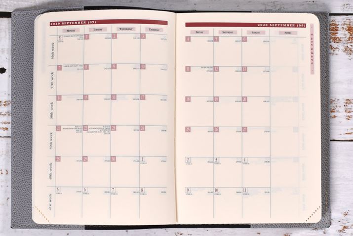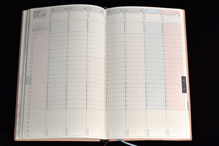 左ページの3/4が土日に割かれたリア充フォーマットは、ビジネスパーソン向けとしてはあまり例がないもの。1日欄の上下を上品な網かけで分割しているのもスマートだ