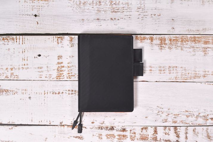 ほぼ日手帳「day-free」に、カバー「オリジナル・カズン/カラーズ『ブラック×オレンジ』」を装着。ほぼ日手帳オリジナルと同じテイストで、表紙と裏表紙それぞれのホルダーにペンをさして固定する「バタフライストッパー」も継承している
