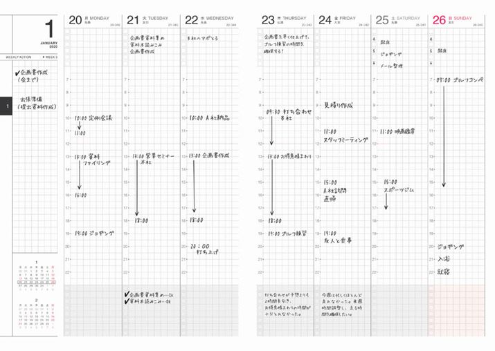 週間の予定欄は、横罫のみで時間軸がない。また、土日は平日の1日分のスペースに縮小されて収まっているが、1日分のマスを2分割して、縦に時間軸を振ることで細かな予定を管理できる。つまり、意外と応用範囲が広いのだ。