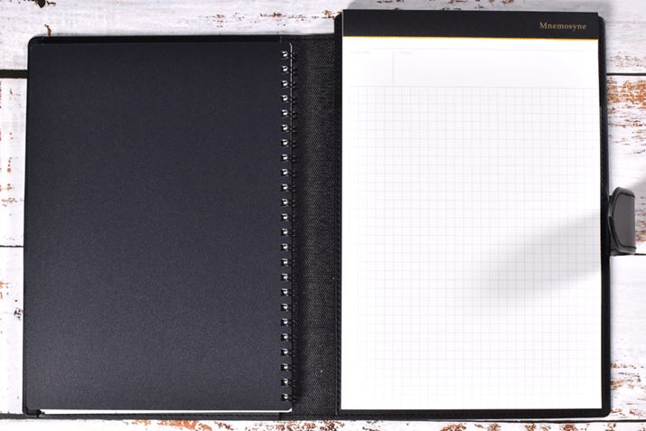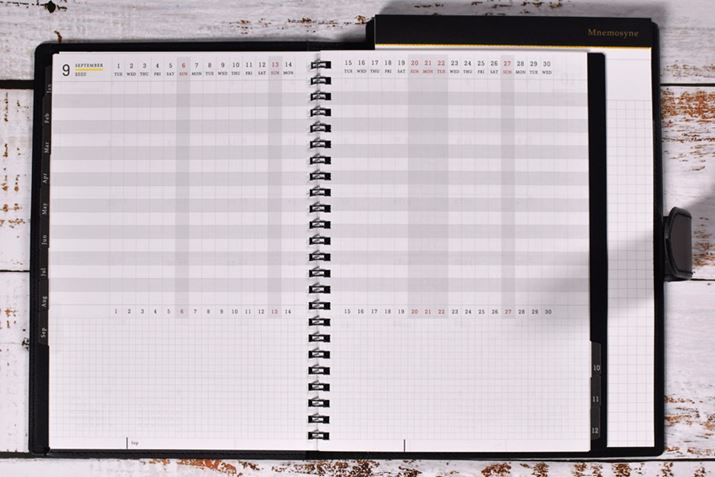 手帳部分は、ツインリングタイプで180°パタンと大きく開く。「月間ブロック」のページは方眼ベース。欄外まで方眼なので、ToDoリストにもメモにも使える