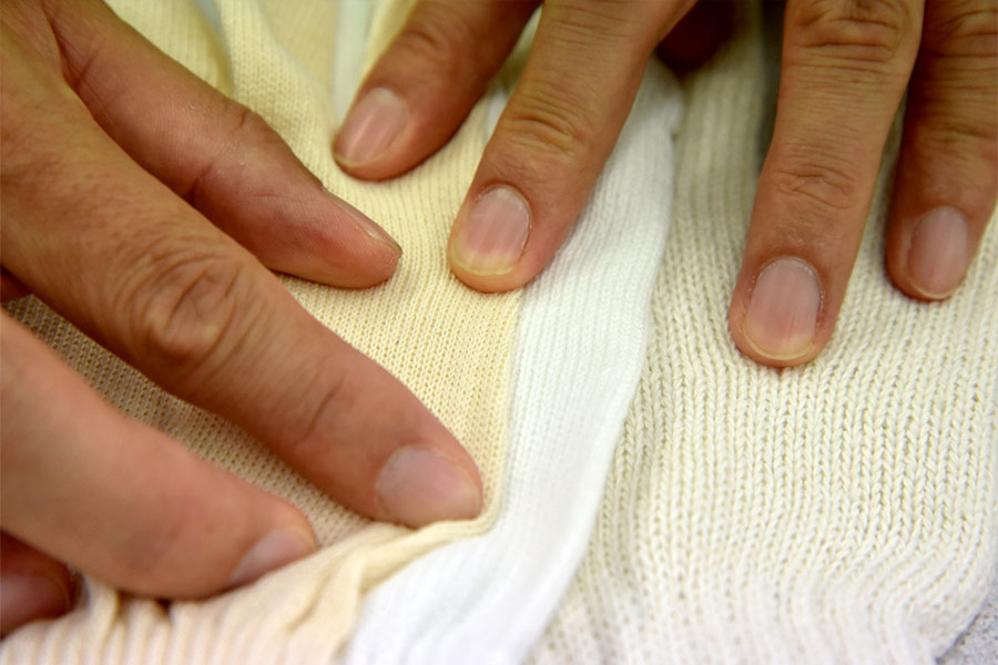 徳永「糸の本数は純綿が5本編み、特紡は2本編みが主流です。糸の太さは10番手、20番手が多く、針の密度は7ゲージが一般的です。ただ、同じ7ゲージの軍手を作る場合、『5本×10番手』と『10本×20番手』だったらそこまで差がないように思いませんか? しかし、実際は後者のほうが優れています。なぜなら、細い糸で多く編んだほうが網目がキュッと締まるため強度が増すんですよ」