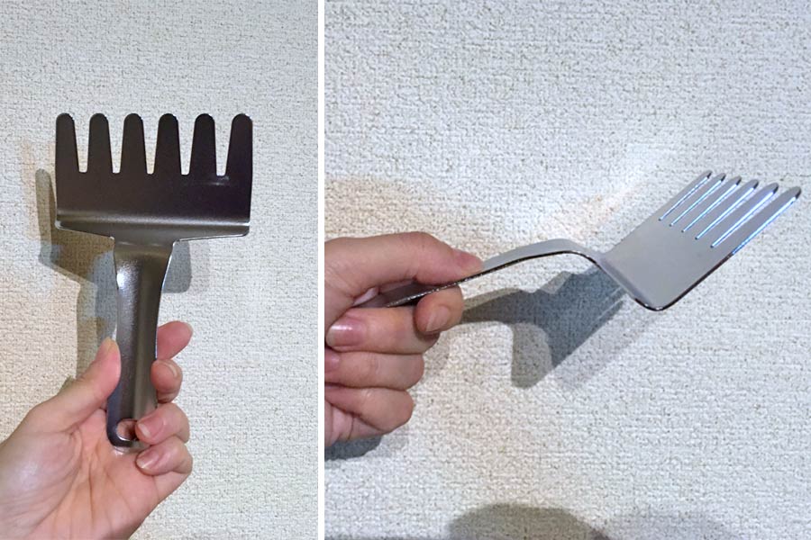 フォークのようになっている下側のパーツで、アミの下から魚をすくい取ります。波形になっていて、強すぎないやさしい力加減で魚をキャッチできますよ。