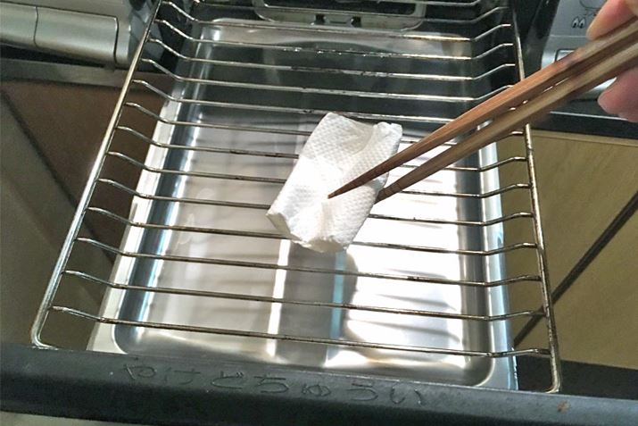 まずグリルのアミを取り外し、受け皿部分にアルミ箔を敷き、その上に吸水紙を乗せます