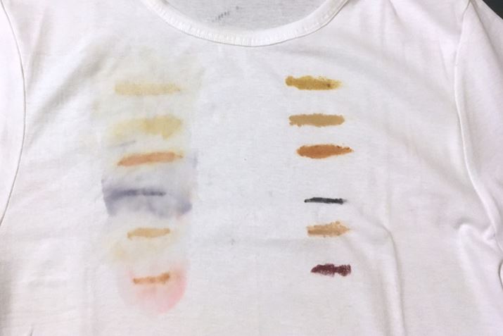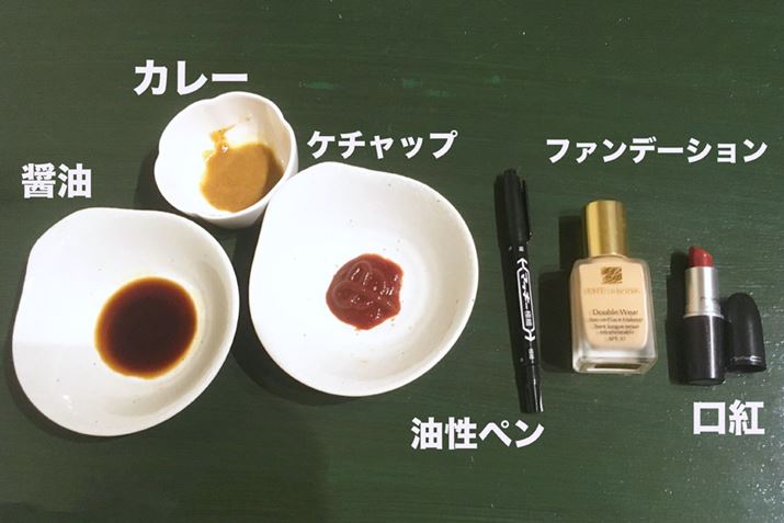 シミの定番と言えるであろう、カレー、醤油、ケチャップ、油性ペン、ファンデーション、口紅の6つの素材を用意しました。これを綿100%の白いTシャツに付けて、「あにはからんや」でちゃんと取れるか検証していきます。