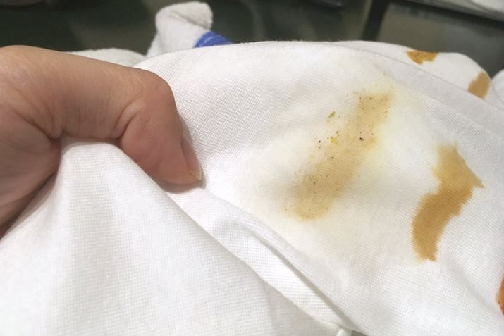 まずはカレー。香辛料や油などさまざまな成分が入っていて、取れにくいシミの代表格ですよね。シミを取る様子を動画に収めたのでご覧ください。