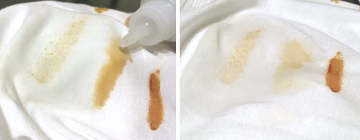 中身はサラサラとした液体なので、結構たっぷり出てしまいますが、そのくらいでちょうどよさそうです。少しずつだと落ちなさそうなのでたっぷり使って下のタオルに染み込ませたところ、結構落ちました! 香辛料の固形のようなものがやや残っていますが、すでにかなり薄くなっていますね。