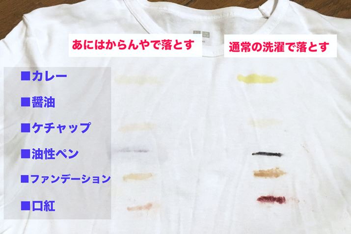 意外にも、醤油とケチャップは洗濯のみと大差がない結果に。落ちやすいのでしょうか。それ以外は、「あにはからんや」を使用したほうが軒並み薄くなっています。