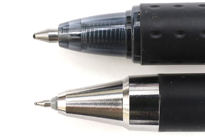 従来の「フリクション」シリーズ(上)と「ポイントノック04」(下)のペン先。「シナジーチップ」はキュッと先端が細くなっている