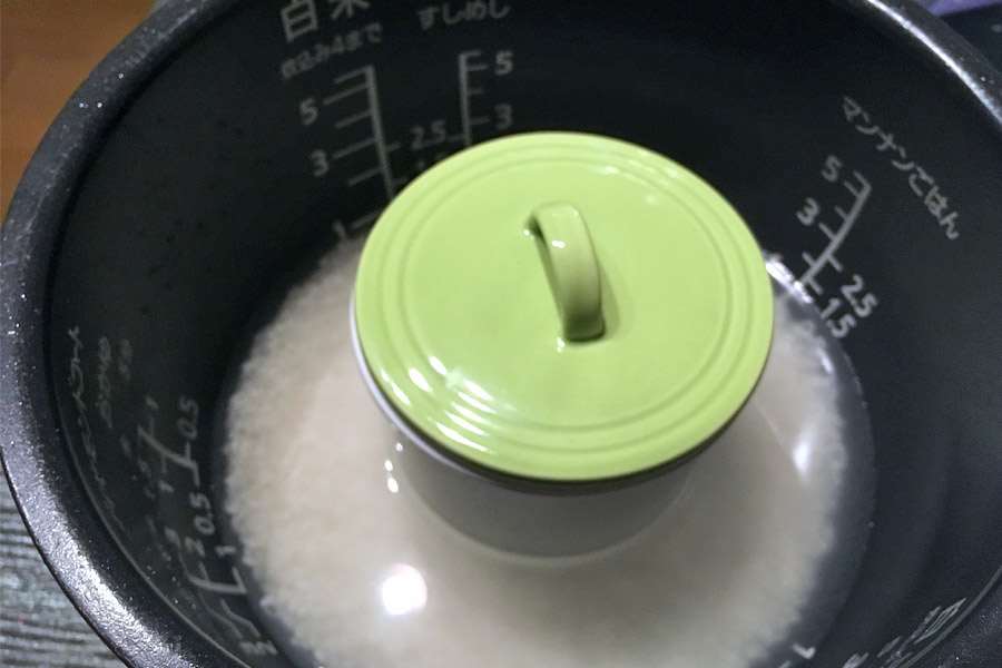 炊飯器にといだお米と水を入れ、お米の中央を少し掘って、フタをしたエコカップを水平に押し込めます。