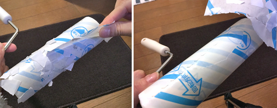 先ほどのニトムズの「コロコロ ハイグレードSC」と比べると少しゴミが残っていますが、ほとんど取れているので粘着力はなかなか。テープには青いラインと「めくり側」がわかるマークが配されていて、めくり口がわかりやすくなっています。ただ、ミシン目の通りにまっすぐ切れずに、少しちぎりすぎてしまうことも。
