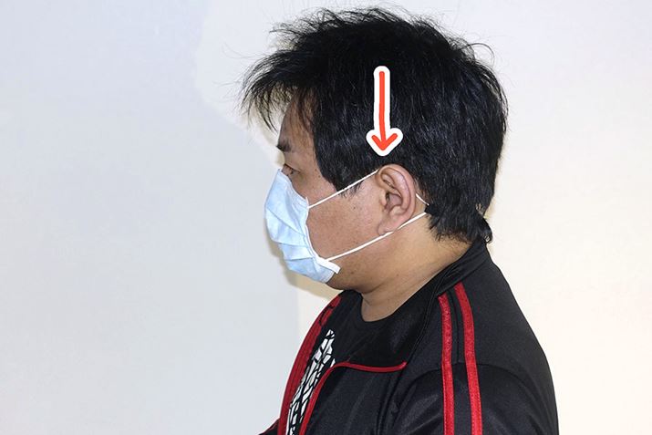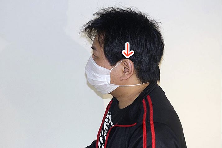 見ての通り、まったく耳にヒモが当たっていないので「耳痛い」対策としてはバッチリ! ただ、通常よりも低い位置で固定しているため、長時間付けていると、少しずつズリ落ちてくる感じがありました。