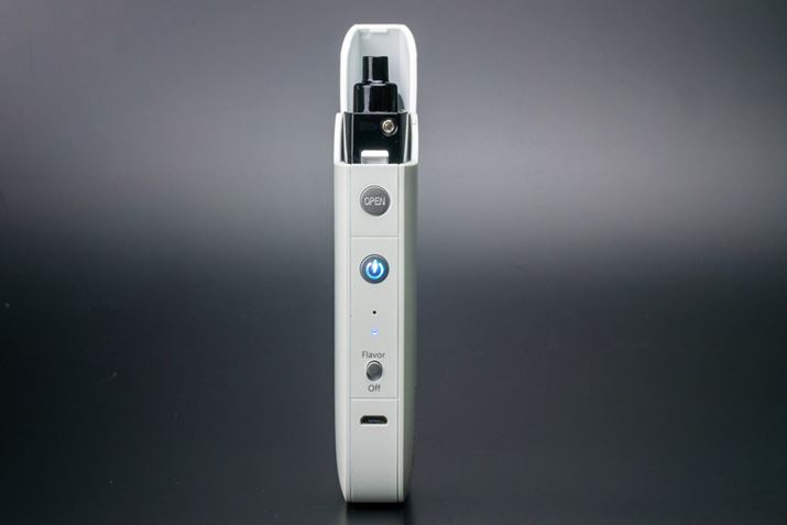側面の上部にあるボタンがオープンボタンで、その下にあるのが電源ボタンだ。さらに下にはモード切り替えスイッチ。「OFF」にすると水素吸引モード、「Flavor」でフレーバー吸引モードになる