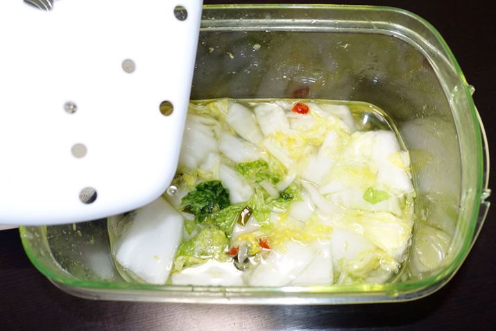 「白菜にこんなに水分が含まれていたのか!?」と驚くくらいガッツリ水分が出て、いい感じに漬かっております。