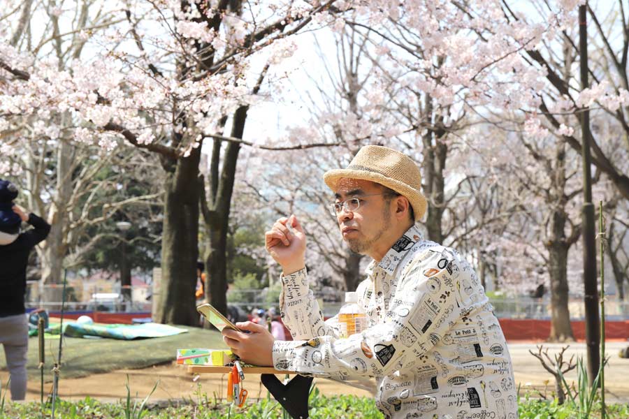 ほぼ満開の桜の下で、編集者とチャットで打ち合わせ中。「今、花見テレワーク中です。楽しー」と打ったら、「チッ……」と舌打ちで返された