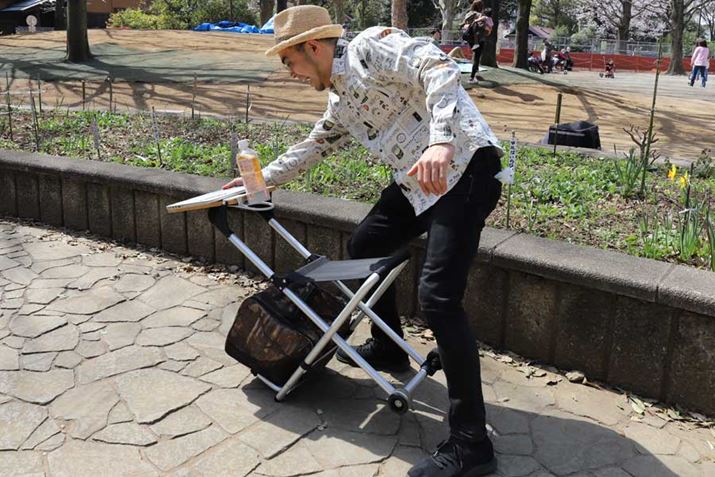 さて、「今日はここで仕事したいなー」と思えるナイス場所が見つかったら、その場で展開しましょう。まず、フレームをX字に開いたら、机をクルッと回転させてキャリーハンドルの上に載せる……以上です。所要時間大体3秒ぐらいで、カートがイスと机に早変わり。