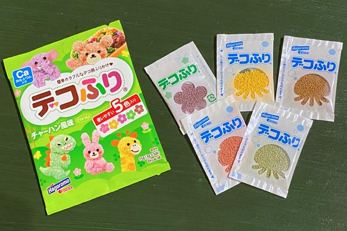まずは、色付きご飯を作るアイテムです。デコ弁では、ケチャップやカレー粉などを使ってご飯をかわいい色にするのが定番テクニックですが、それをふりかけで簡単&色鮮やかにできちゃうのがこの「デコふり」。