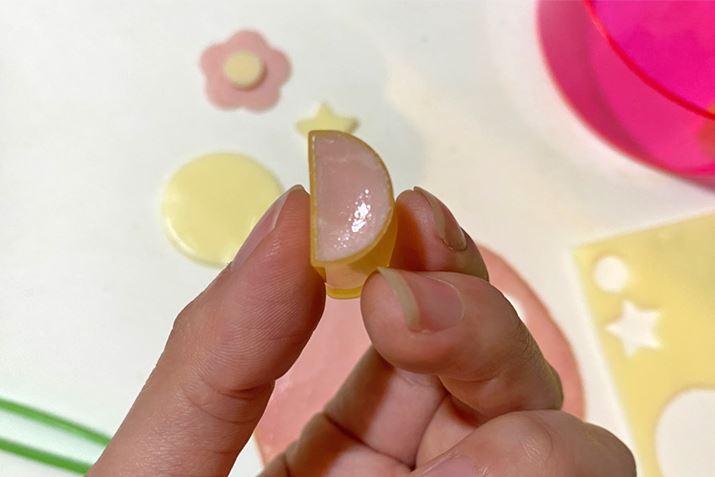 また、このようにどうしても型抜きに具材がハマってしまうので、そっとピンセットでつついて取る必要があります