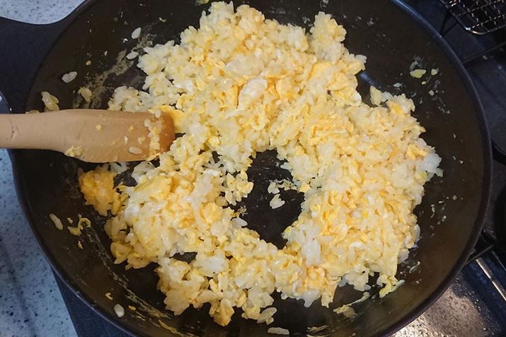溶いた卵をいれて固まりかけたところでご飯投入。基本的なチャーハンの作り方です