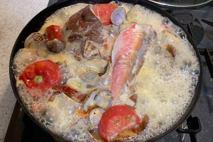 魚介をオリーブオイルやトマト、アンチョビ、水で味付けするアクアパッツァ。激しく沸騰させることでオイルと水を乳化させるのがおいしさのコツなのですが、蓄熱性の高いバーミキュラ フライパンなら、しっかり乳化もできました