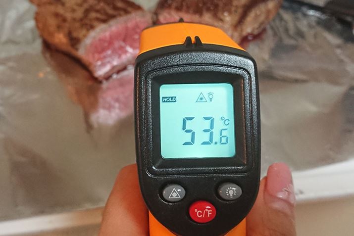 写真では少々生っぽく見えますが、カットして計ったら中心温度は約53℃。レアステーキとしては最適な温度です