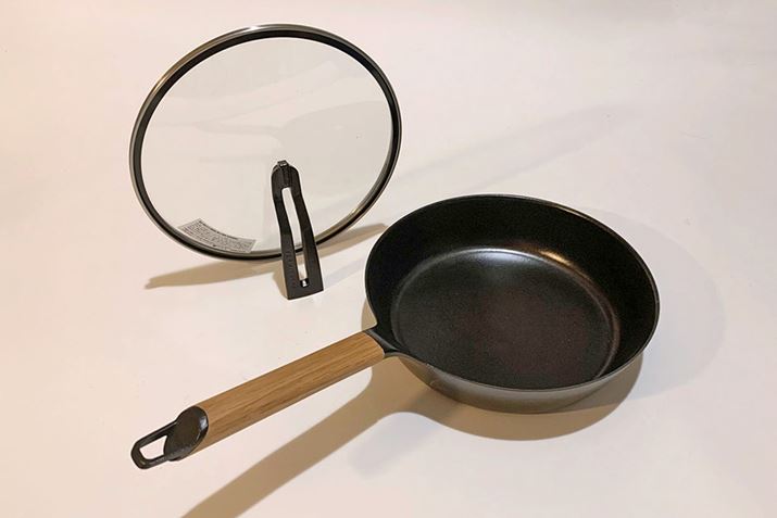 「バーミキュラ フライパン 24cm 深型」。ハンドル部分はオーク材かウォールナット材で、我が家にきた製品はオーク材でした。木製なのでハンドルが熱くなりません。ちなみに、奥にある「24cm フライパン専用リッド」(フタ)は別売り製品となります