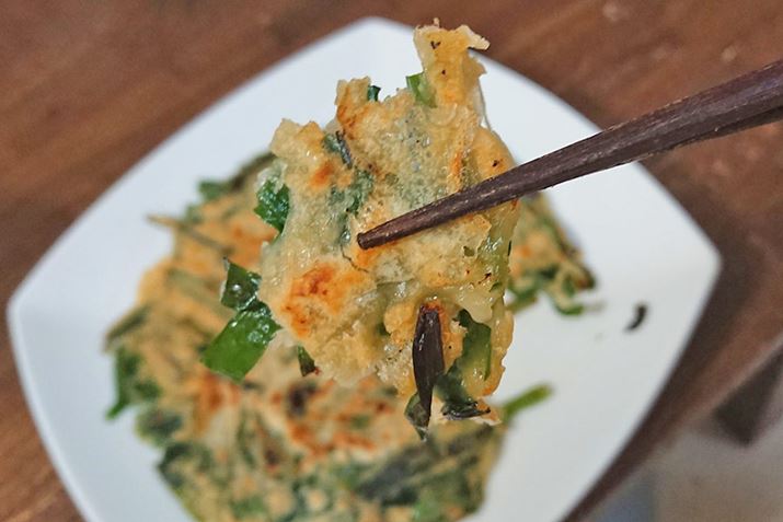 こちらは冷蔵庫の中にあまっていたニラで作ったチヂミ。表面がパリッパリに焼けているのがおわかりいただけるでしょうか?