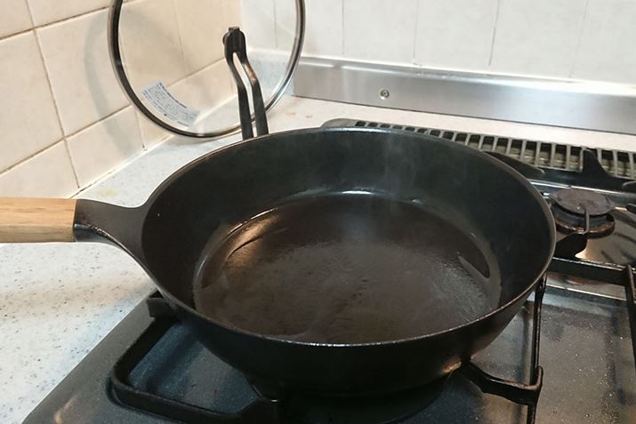 最初にトライするのは目玉焼きです。バーミキュラ フライパンは鉄鍋なので、最初に余熱が必要になります。「油を入れて加熱し、煙が立ったら食材を入れる」というのが基本の使い方。焦げやすい食材の場合は、余熱後に火を1度止めてから食材を入れます。