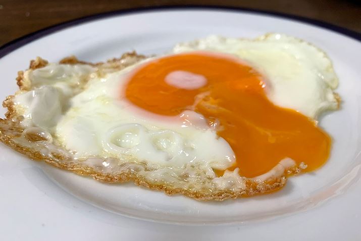 フタをしていないのに黄身の上までじっくり加熱されているのがわかります。フチがカリッとしているのも魅力的。目玉焼きを割ると、適度に加熱されてトロみのついた黄身がトロ〜リ。完璧な加熱!