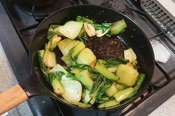 肉を下焼きしたあとのフライパンで、水分量の多いチンゲンサイを炒めたところ。じっくり焼いて芯までシンナリしているのに、フライパンに水分がでてきていないのがわかります
